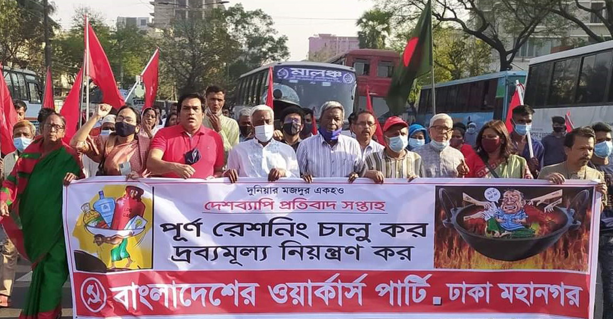 রোববার (১৩ মার্চ) সংগঠনটি রাজধানীতে প্রতিবাদ মিছিল করেছে। মিছিল শেষে তোপখানা রোডের কেন্দ্রীয় কার্যালয়ে বিক্ষোভ সমাবেশ করে। সেখান থেকে রেশনিং ও নিত্যপণ্যের মূল্য নিয়ন্ত্রণের দাবি জানায় পার্টি।