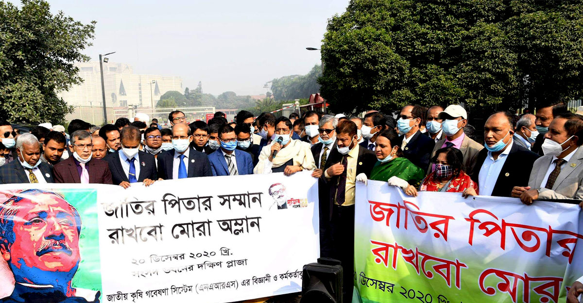 রোববার (২০ ডিসেম্বর) রাজধানীর মানিক মিয়া এভিনিউতে বঙ্গবন্ধুর ভাস্কর্য ভাঙচুরের প্রতিবাদে আয়োজিত মানববন্ধনে তিনি এ কথা বলেন।