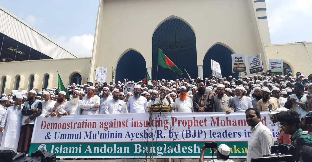 ইসলামী আন্দোলন বাংলাদেশের ঢাকা মহানগর উত্তরের সভাপতি অধ্যক্ষ হাফেজ মাওলানা শেখ ফজলে বারী মাসউদের সভাপতিত্বে বিক্ষোভ উত্তর সমাবেশে প্রধান অতিথির বক্তব্যে মুফতি সৈয়দ মুহাম্মদ ফয়জুল করীম বলেন, চলতি জাতীয় সংসদের অধিবেশন থেকে যদি এই ন্যাক্কারজনক ঘটনায় নিন্দা প্রস্তাব পাস করা না হয়, ভারতীয় হাই কমিশনারকে যদি ডেকে নিন্দা জানানো ও জবাব চাওয়া না হয়, কটূক্তিকারীদের যদি বিচার করা না হয়, তাহলে আগামী ১৬ জুন ভারতীয় দূতাবাস অভিমুখে গণমিছিল ও স্মারকলিপি দেওয়া হবে।