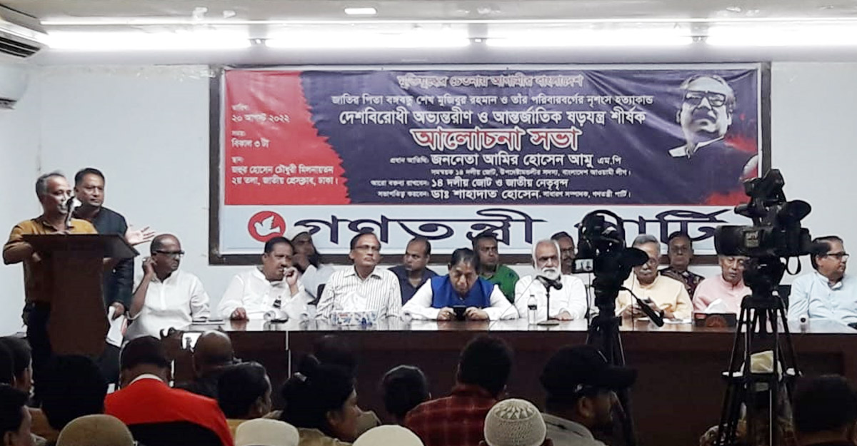 গণতন্ত্রী পার্টির সাধারণ সম্পাদক ডা. শাহাদাত হোসেনের সভাপতিত্বে ‘দেশবিরোধী অভ্যন্তরীণ ও আন্তর্জাতিক ষড়যন্ত্র’ শীর্ষক অলোচনা সভায় অন্যান্যদের মধ্যে, জাতীয় পার্টি জেপির প্রেসিডিয়াম সদস্য এজাজ আহম্মেদ মুক্তা, কমিউনিস্ট কেন্দ্রের আহ্বায়ক ডা. ওয়াজেদুল ইসলাম খান, ন্যাপের ভারপ্রাপ্ত মহাসচিব ইসমাইল হোসেন, বাসদের আহ্বায়ক রেজাউর রশিদ, জাতীয় সমাজতান্ত্রিক দল জাসদের যুগ্ম সাধারণ সম্পাদক রোকনুজ্জামান রোকন প্রমুখ বক্তব্য রাখেন।