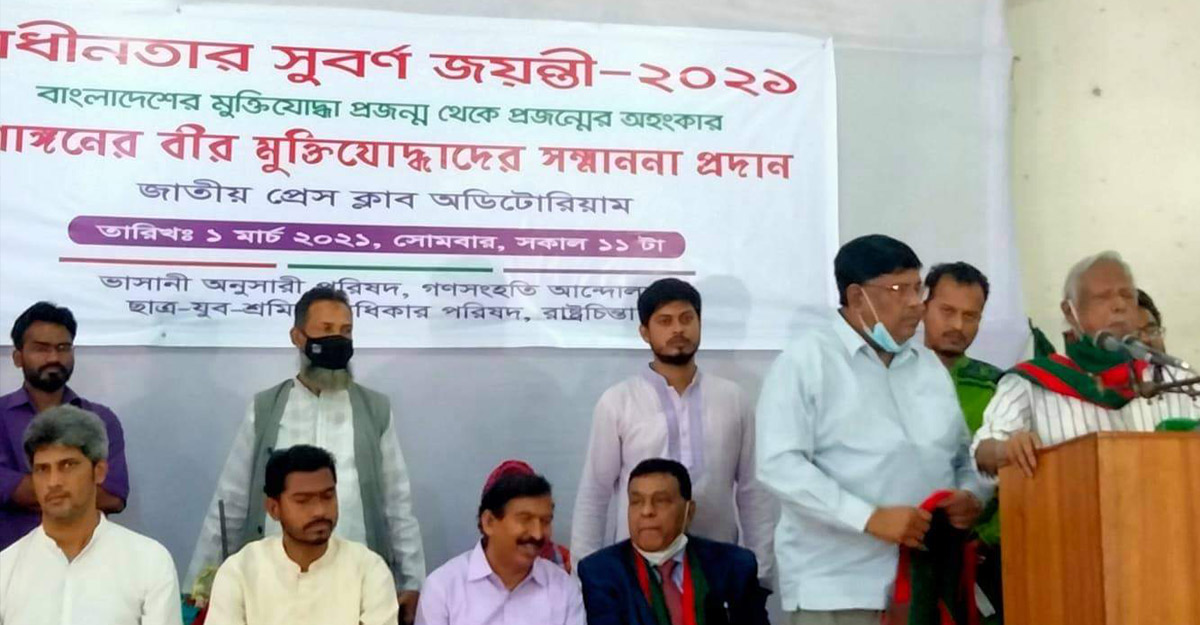 এসময় বীর মুক্তিযোদ্ধা আবদুল কাইয়ুম খান, আবুল হোসাইন, কেএম মাহবুবুল আলম, আব্দুল্লাহীল সাফী, মকবুল হোসেন সন্টু, হাবিবুর রহমানসহ প্রমুখ মুক্তিযোদ্ধাকে সম্মাননা প্রদান করা হয়। এসময় উপস্থিত ছিলেন ভাসানী অনুসারী পরিষদের নেতা ফরিদ উদ্দিন, গণসংহতি আন্দোলনের সমন্বয়ক জোনায়েদ সাকি, রাষ্ট্রচিন্তার আইনজীবী হাসনাত কাইয়ুম, ডাকসুর সাবেক ভিপি নুরুল হক নূর, ছাত্র অধিকার পরিষদের ভারপ্রাপ্ত আহ্বায়ক রাশেদ খান, যুগ্ম আহ্বায়ক ফারুক হাসান প্রমুখ।