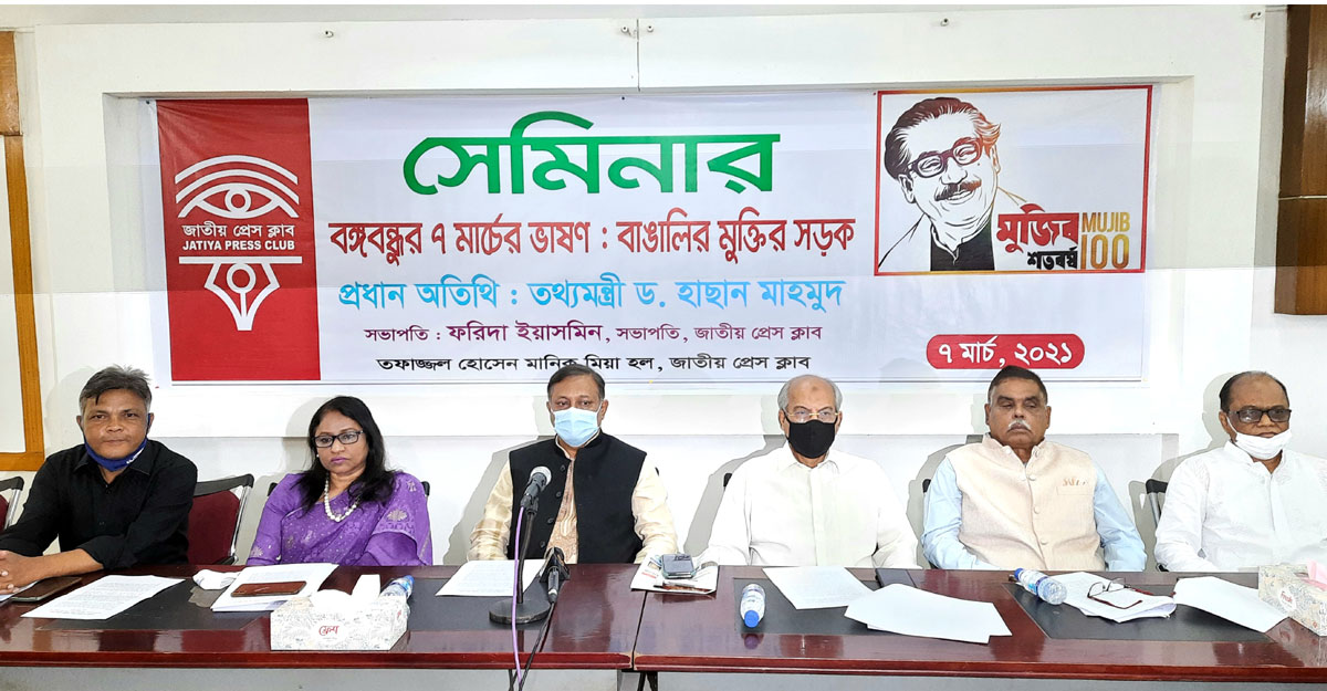রোববার (৭ মার্চ) জাতীয় প্রেসক্লাবের তফাজ্জল হোসেন মানিক মিয়া হলে ‘বঙ্গবন্ধুর ৭ মার্চের ভাষণ : বাঙালির মুক্তির সড়ক’ শীর্ষক সেমিনারে তিনি এসব কথা বলেন।