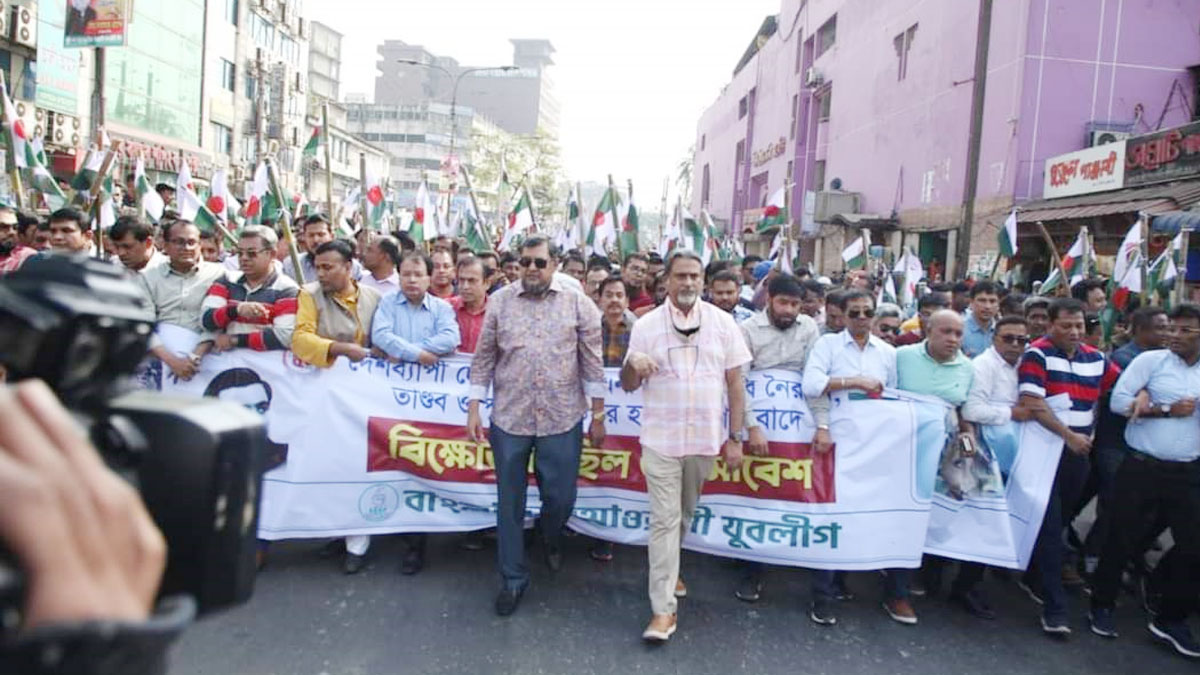 যুবলীগ চেয়ারম্যান শেখ ফজলে শামশ পরশ ও সাধারণ সম্পাদক মাইনুল হোসেন খান নিখিলের নেতৃত্বে ঢাকা মহানগরের বঙ্গবন্ধু এভিনিউ এলাকায় মিছিল বের করা হয়।