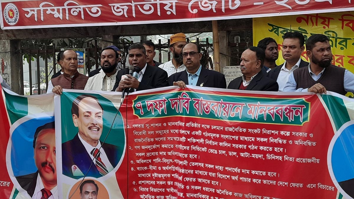 গণতন্ত্র, সুশাসন ও মানবাধিকার প্রতিষ্ঠার লক্ষ্যে চলমান রাজনৈতিক সংকট নিরসন করতে সরকার ও বিরোধী দলগুলোর মধ্যে অবিলম্বে একটি গঠনমূলক সংলাপের মাধ্যমে সব নিবন্ধিত ও অনিবন্ধিত রাজনৈতিক দলের সমন্বয়ে একটি শক্তিশালী নির্বাচনকালীন সরকার গঠনসহ সাত দফা দাবি জানিয়েছে সম্মিলিত জাতীয় জোট।