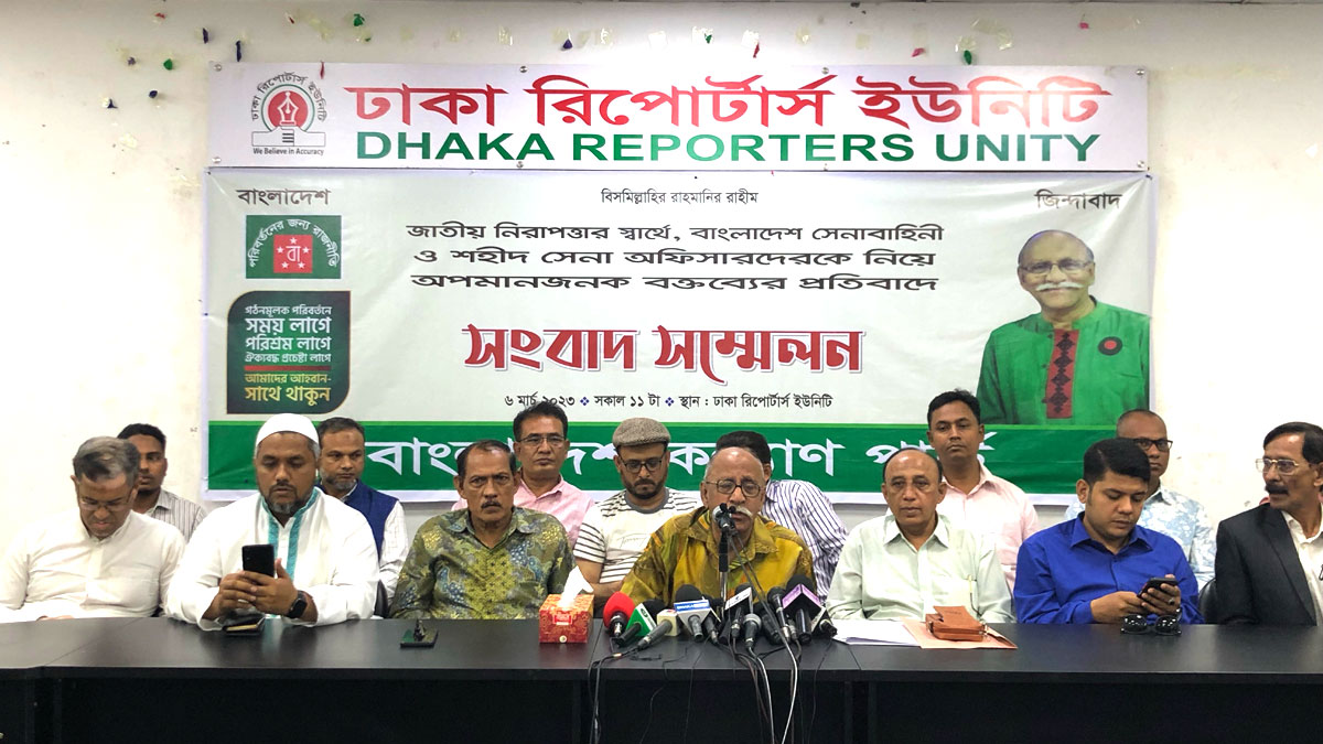 সোমবার (৬ মার্চ) ঢাকা রিপোর্টাস ইউনিটিতে (ডিআরইউ) বাংলাদেশ কল্যাণ পার্টি কর্তৃক আয়োজিত ‘বাংলাদেশ সেনাবাহিনী ও শহীদ সেনা অফিসারদের নিয়ে অপমানজনক বক্তব্যের প্রতিবাদ’ শীর্ষক এক সংবাদ সম্মেলনে তিনি এসব কথা বলেন।