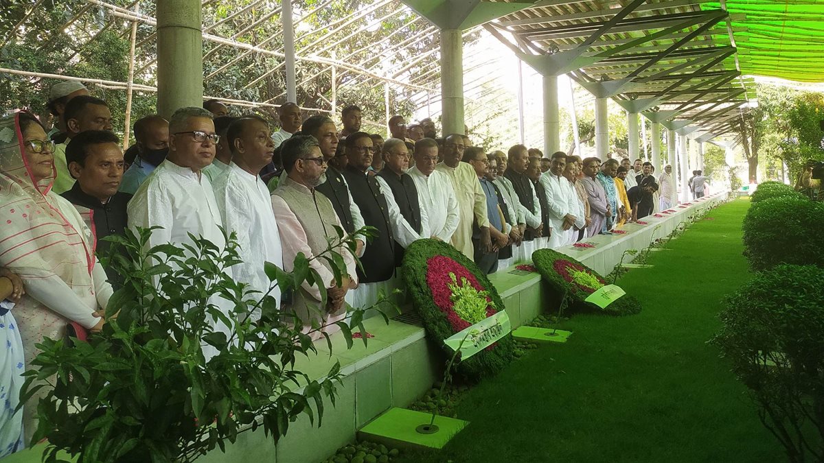 এরপর আওয়ামী লীগের পক্ষ থেকে পুস্পস্তবক অর্পণ করেন ওবায়দুল কাদের। এসময় উপস্থিত ছিলেন আওয়ামী লীগের সভাপতিমণ্ডলীর সদস্য ডা. মোস্তফা জালাল মহিউদ্দিন, যুগ্ম সাধারণ সম্পাদক ড. হাছান মাহমুদ, আ ফ ম বাহাউদ্দিন নাছিম, সাংগঠনিক সম্পাদক আহমদ হোসেন, এসএম কামাল হোসেন, অ্যাড. আফজাল হোসেন, বিজ্ঞান ও প্রযুক্তি বিষয়ক সম্পাদক ইঞ্জি. আবদুস সবুর, সংস্কৃতি বিষয়ক সম্পাদক অসীম কুমার উকিল, কৃষি বিষয়ক সম্পাদক ফরিদুন্নাহার লাইলী, শিক্ষা ও মানবসম্পদ বিষয়ক সম্পাদক শামসুন নাহার চাপা, উপপ্রচার ও প্রকাশনা বিষয়ক সম্পাদক আব্দুল আউয়াল শামীম, কার্যনিবাহী সদস্য আনোয়ার হোসেন, শাহাবুদ্দিন ফরাজী প্রমুখ।