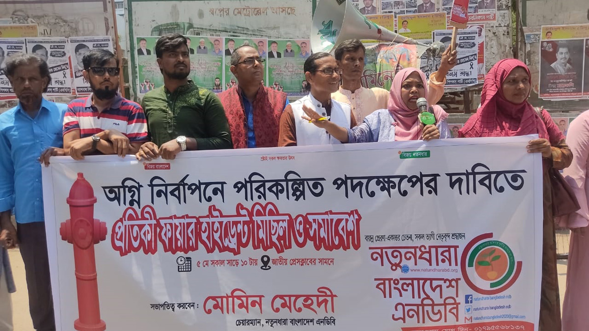 অগ্নিনির্বাপণে পরিকল্পিত পদক্ষেপের দাবিতে প্রতীকী ফায়ার হাইড্রেন্ট মিছিল ও সমাবেশ করেছে নতুনধারা বাংলাদেশ (এনডিবি)। শুক্রবার (৫ মে) জাতীয় প্রেস ক্লাবের সামনে এ সমাবেশ অনুষ্ঠিত হয়।