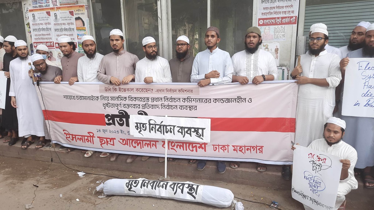 ‘তিনি কি ইন্তেকাল করেছেন?’ বরিশাল সিটি নির্বাচনে হাতপাখার প্রার্থী ইসলামী আন্দোলন বাংলাদেশের আমির মুফতি সৈয়দ মোহাম্মদ ফয়জুল করিমকে নিয়ে প্রধান নির্বাচন কমিশনারের (সিইসি) এমন মন্তব্যের প্রতিবাদ করেছে ইসলামী ছাত্র আন্দোলন বাংলাদেশ (ঢাকা মহানগর)। প্রতিবাদের অংশ হিসেবে তারা নির্বাচনী ব্যবস্থাকে প্রতীকী দাফন করেছে।