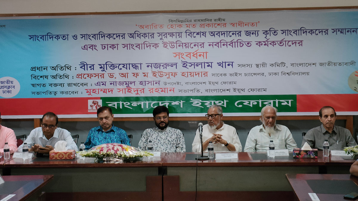 বোববার (২৫ জুন) প্রেস ক্লাবে বাংলাদেশ ইয়ুথ ফোরাম কর্তৃক আয়োজিত সাংবাদিকতা ও সাংবাদিকদের অধিকার সুরক্ষায় বিশেষ অবদানের জন্য কৃতি সাংবাদিকদের সম্মাননা শীর্ষক এক সংবর্ধনা অনুষ্ঠানে প্রধান অতিথির বক্তব্যে তিনি এসব কথা বলেন।