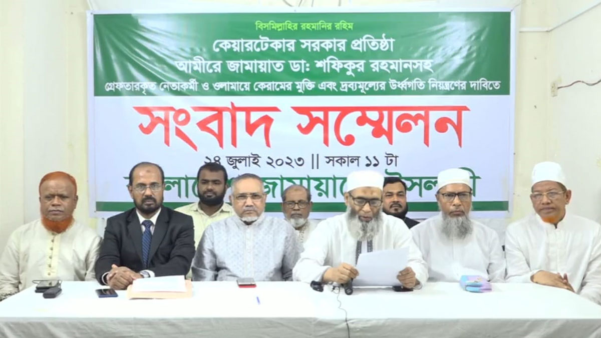 সুষ্ঠু ও অংশগ্রহণমূলক নির্বাচনের লক্ষ্যে অবিলম্বে তত্ত্ববধায়ক সরকার ব্যবস্থা প্রতিষ্ঠা, আমির ডা. শফিকুর রহমানসহ গ্রেপ্তার নেতাকর্মী ও আলেম-ওলামাদের মুক্তি এবং দ্রব্যমূল্যের ঊর্ধ্বগতি নিয়ন্ত্রণের দাবিতে আগামী ১ আগস্ট ঢাকায় সমাবেশ কর্মসূচি পালনের ঘোষণা করেছে জামায়াতে ইসলামী।
