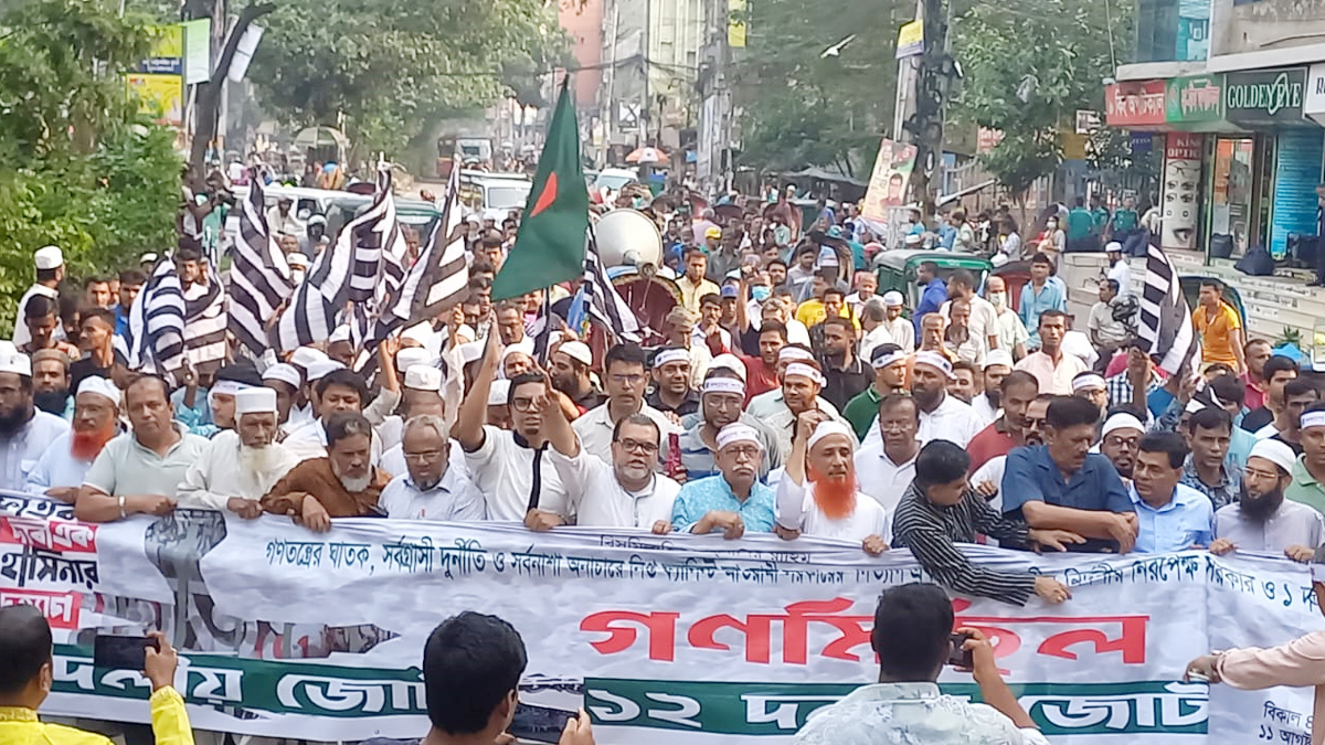 শুক্রবার (১১ আগস্ট) বিকেলে রাজধানীর বিজয়নগরে এক গণমিছিল পূর্ব সংক্ষিপ্ত সমাবেশে বক্তারা এসব কথা বলেন। পরে শেখ হাসিনার পদত্যাগ ও নির্দলীয় নিরপেক্ষ সরকারের অধীনে দ্বাদশ জাতীয় সংসদ নির্বাচন অনুষ্ঠানের দাবিতে বিজয়নগর পানির ট্যাঙ্কি সংলগ্ন সড়ক থেকে এক গণমিছিল অনুষ্ঠিত হয়। পরে জোটের গণমিছিল শান্তিনগর মোড়ে গিয়ে শেষ হয়।