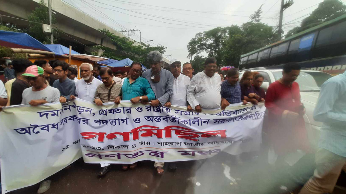 দমন, নিপীড়ন, গ্রেপ্তার ও রাষ্ট্রীয় সন্ত্রাসের প্রতিবাদে এবং সরকারের পদত্যাগ ও অন্তবর্তীকালীন সরকার গঠনের দাবিতে গণতন্ত্র মঞ্চের গণমিছিল শুরু হয়েছে।