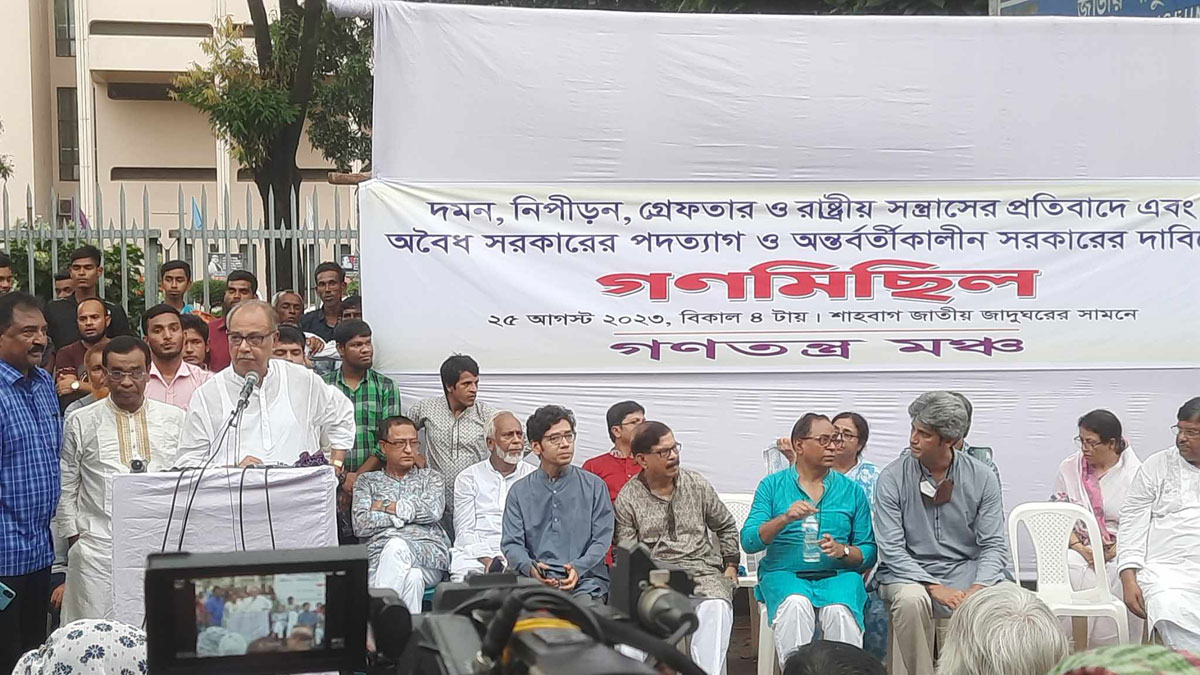 শুক্রবার (২৫ আগস্ট) রাজধানীর শাহবাগে জাতীয় জাদুঘরের সামনের সড়কে গণমিছিল শুরুর আগে গণতন্ত্র মঞ্চ আয়োজিত সমাবেশে এসব কথা বলেন বক্তারা। দমন, নিপীড়ন, গ্রেপ্তার ও রাষ্ট্রীয় সন্ত্রাসের প্রতিবাদে এবং সরকারের পদত্যাগ ও অন্তবর্তীকালীন সরকারের দাবিতে এ সমাবেশের আয়োজন করা হয়।