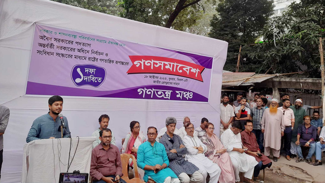 সরকারের পদত্যাগ, অন্তর্বর্তীকালীন সরকারের অধীনে নির্বাচন ও সংবিধান সংস্কারের মাধ্যমে রাষ্ট্রের গণতান্ত্রিক ব্যবস্থা পুনর্বহালের এক দফা দাবিতে গণতন্ত্র মঞ্চ আয়োজিত গণসমাবেশ শুরু হয়েছে।