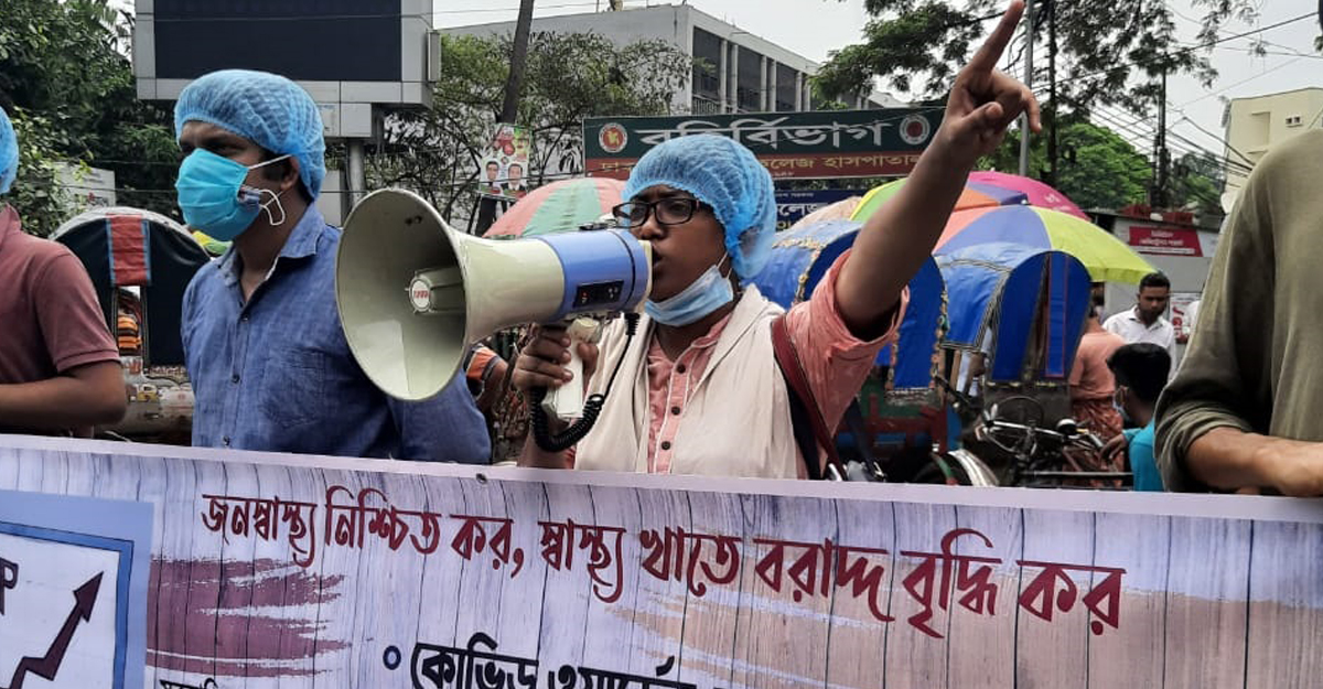 এ বৈশ্বিক মহামারি দেশের চিকিৎসার ভঙ্গুর দশা প্রকাশিত করছে উল্লেখ করে বক্তারা বলেন, সরকারের বেসরকারিকরণের নীতিতে পাবলিক প্রতিষ্ঠানগুলোর বিকশিত করার পরিকল্পনা নেই। বরাদ্দ অপ্রতুল থাকায় মানুষ বেসরকারি প্রতিষ্ঠানের দিকে ঝুঁকে পড়ে। এই নীতির কারণে জনস্বাস্থ্যের বিষয়টি পুরোই অবহেলিত। করোনাকালে এটি নগ্নভাবে সামনে এসেছে।