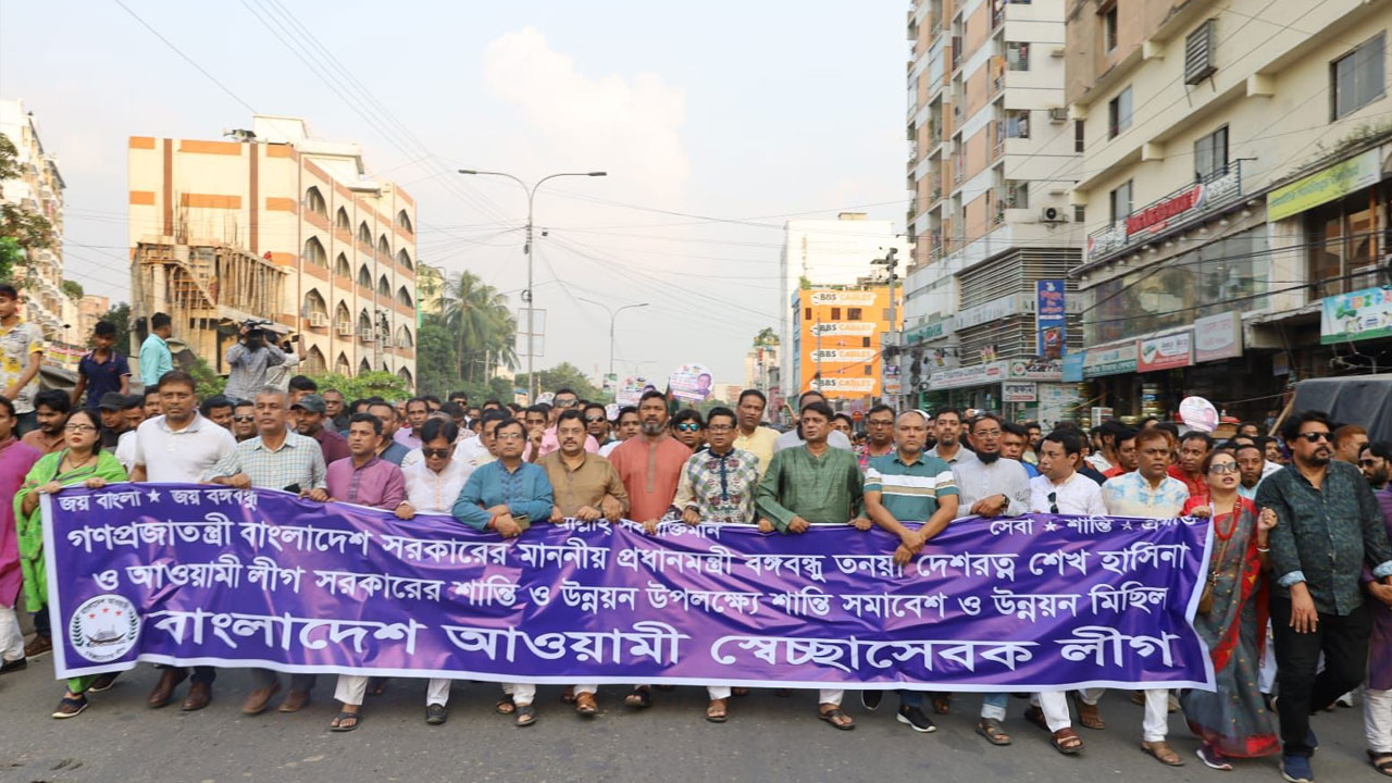 আওয়ামী লীগ সভাপতি ও প্রধানমন্ত্রী শেখ হাসিনার নির্দেশে আওয়ামী স্বেচ্ছাসেবক লীগের উদ্যোগে শান্তি ও উন্নয়নের সমর্থনে মিছিল অনুষ্ঠিত হয়েছে।