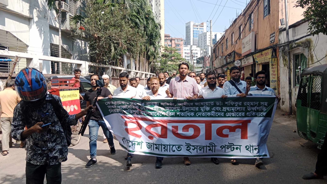 হরতাল সমর্থনে রাজধানীর সেগুনবাগিচায় ঝটিকা মিছিল করেছে বাংলাদেশ জামায়াতে ইসলামী ও শিবির কর্মীরা।