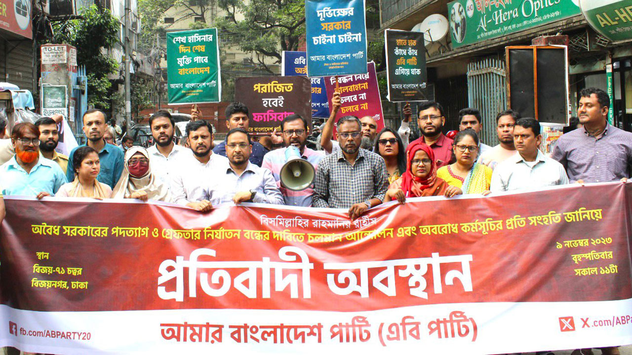 অবৈধ সরকারের পদত্যাগ ও গ্রেপ্তার নির্যাতন বন্ধের দাবিতে চলমান আন্দোলন এবং ৪৮ ঘণ্টার অবরোধের প্রতি সংহতি জানিয়ে ‘প্রতিবাদী অবস্থান’ থেকে আবারও সরকারের পদত্যাগ দাবি করেছে আমার বাংলাদেশ পার্টি (এবি পার্টি)।