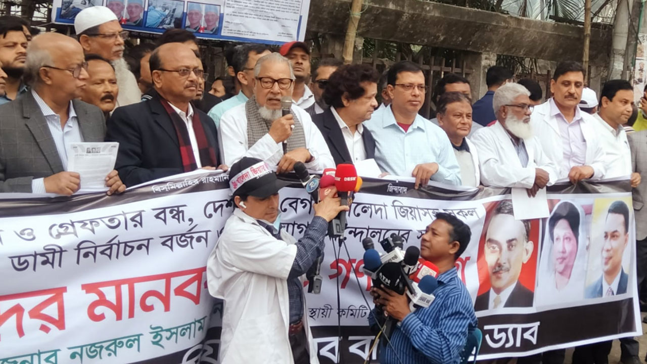 বুধবার (২৭ ডিসেম্বর) দুপুরে জাতীয় প্রেস ক্লাবের সামনে ভোট বর্জন, খালেদা জিয়াসহ নেতাকর্মীদের মুক্তির দাবিতে এক মানববন্ধনে এ আহ্বান জানান তিনি। চিকিৎসকদের সংগঠন ড্যাব আয়োজিত এই মানববন্ধন শেষে প্রেস ক্লাবের সামনে 'ভোট বর্জন ও অসহযোগ আন্দোলনের' পক্ষে লিফলেট বিতরণ করা হয়।