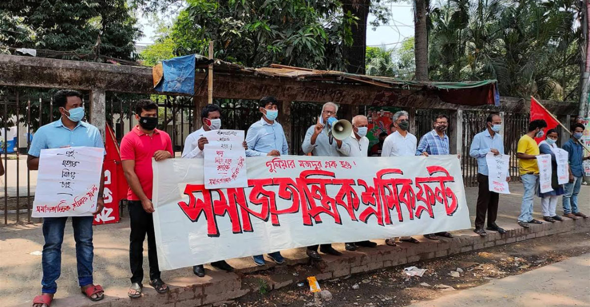 সমাবেশে বক্তারা বলেন, করোনা সংক্রমণরোধে সরকার ঘোষিত লকডাউনে অপ্রাতিষ্ঠানিক খাতের শ্রমজীবী মানুষরা কর্মহীন হয়ে পড়েছে। আর প্রাতিষ্ঠানিক খাতের কর্মরত শ্রমিকেরা প্রাপ্ত মজুরি দিয়ে স্বাস্থ্য সুরক্ষা ব্যয় ও দ্রব্যমূল্যের ঊর্ধ্বগতির কারণে যন্ত্রণার মধ্যে জীবন-যাপন করছে। এই শ্রমজীবী মানুষদের রক্ষার দায়িত্ব সরকার নেয়নি। অথচ সরকার এসআলম গ্রুপের ঋণের ৩ হাজার কোটি টাকা মাফ করে দিয়েছে। প্রণোদনার নামে মালিকদের হাজার-হাজার কোটি টাকা নামমাত্র সুদে ঋণ দিয়েছে। অল্প মজুরিতে অধিক কাজ করানো, শ্রমিকদের প্রাপ্য পাওনা আত্মসাৎ, প্রতিবাদ করলে নির্মম নিপীড়নের মাধ্যমে দমন করাসহ মালিকদের সব অনৈতিক চর্চাকে প্রচ্ছন্নভাবে প্রশ্রয় দিচ্ছে। রাষ্ট্র নিপীড়িতকে রক্ষার বদলে নিপীড়কের ভাড়াটে বাহিনীর ভূমিকা নিয়েছে। রাষ্ট্রের এই দায়িত্বহীন আচরণ শিল্পমালিকদের আরও নির্মম হতে উৎসাহিত করছে।