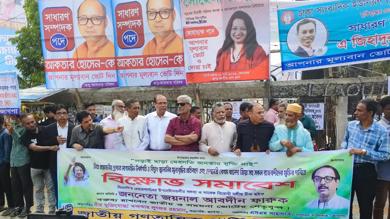 বৃহস্পতিবার (৭ মার্চ) জাতীয় প্রেস ক্লাবের সামনে জাতীয় গণতান্ত্রিক পার্টি (জাগপা) উদ্যোগে নিত্য প্রয়োজনীয় দ্রব্যের লাগামহীন ঊর্ধ্বগতি ও বিদ্যুৎ জ্বালানির মূল্যবৃদ্ধির প্রতিবাদে এবং দেশনেত্রী বেগম খালেদা জিয়াসহ সব রাজবন্দির মুক্তির দাবিতে আয়োজিত বিক্ষোভ সমাবেশে তিনি এসব কথা বলেন।