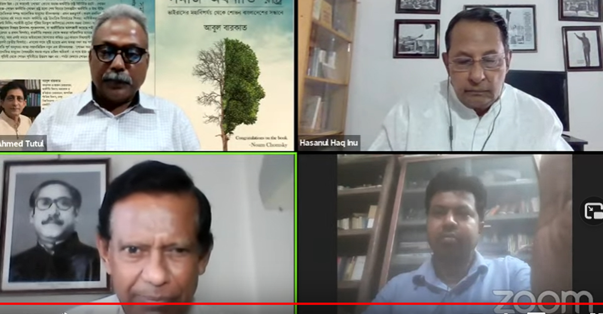 ওয়েবিনারে হাসানুল হক ইনু বলেন, অধ্যাপক বারকাতের এই বই অনেক তথ্যসমৃদ্ধ, তার উপস্থাপিত তথ্য ও ব্যাখ্যা আমি সমর্থন করি। তিনি ঠিকই বলেছেন যে ধর্মের ভুল ব্যাখ্যায় মানুষ ধর্মান্ধ হয়ে পড়ে...রাজনীতির মোক্ষম অস্ত্র হিসেবে মৌলবাদ ব্যবহৃত হয়।