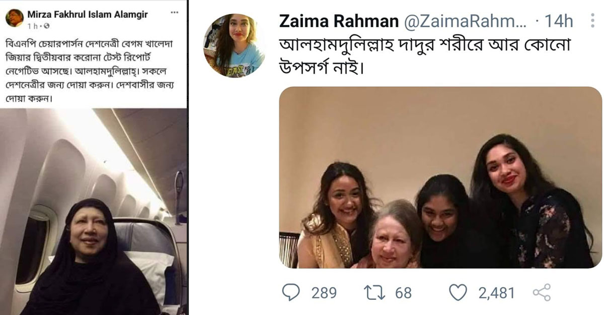 এরপর তারেক রহমানের মেয়ে জাইমা রহমানের ভুয়া টুইটার অ্যাকাউন্ট থেকে একটি ছবি দিয়ে পোস্ট লেখা হয়- ‘আলহামদুলিল্লাহ দাদুর শরীরে আর কোনো উপসর্গ নেই।’