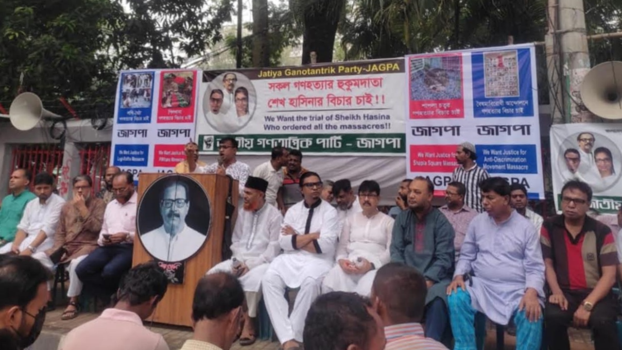 সমাবেশের সভাপতিত্ব করেন জাতীয় গণতান্ত্রিক পার্টির সহসভাপতি ও দলীয় মুখপাত্র রাশেদ প্রধান। তিনি বলেন, গত পনেরো বছর বাংলাদেশ রক্তের স্রোতের উপর পরিচালিত হয়েছে। একটি দানবীয় স্বৈরশাসক বাংলাদেশকে গণহত্যা ও গুম-খুনের রাষ্ট্রে পরিণত করেছে। আমরা সেই দানবীয় খুনি শেখ হাসিনার বিচার চাই। অবিলম্বে শেখ হাসিনাকে ভারত থেকে বাংলাদেশে ফেরত এনে দ্রুত বিচার কাজ শেষ করতে হবে।