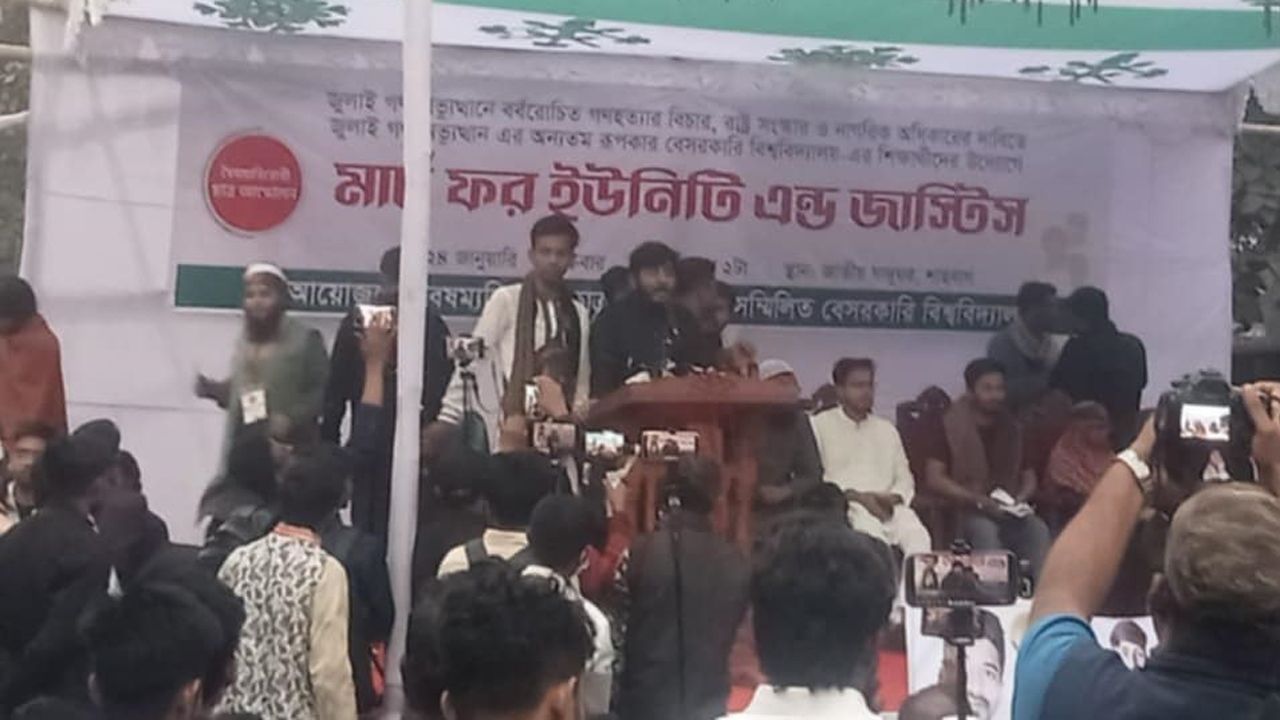 শুক্রবার (২৪ জানুয়ারি) বিকেলে রাজধানীর শাহবাগের জাতীয় জাদুঘরের সামনে বৈষম্যবিরোধী ছাত্র আন্দোলন, সম্মিলিত বেসরকারি বিশ্ববিদ্যালয় শাখা আয়োজিত ‘মার্চ ফর ইউনিটি অ্যান্ড জাস্টিস’ শীর্ষক ছাত্র সমাবেশ তিনি এ কথা বলেন।