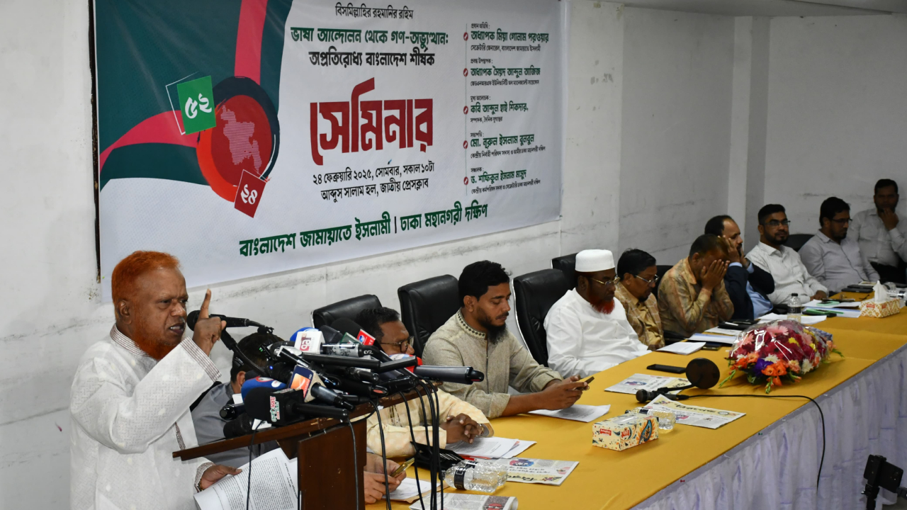সোমবার (২৪ ফেব্রুয়ারি) দুপুরে জাতীয় প্রেসক্লাবের আবদুস সালাম হলে বাংলাদেশ জামায়াতে ইসলামী ঢাকা মহানগরী দক্ষিণের উদ্যোগে আয়োজিত ‘ভাষা আন্দোলন থেকে গণঅভ্যুত্থান অপ্রতিরোধ্য বাংলাদেশ’ শীর্ষক সেমিনারে তিনি এসব কথা বলেন।