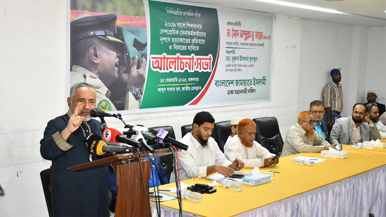মঙ্গলবার (২৫ ফেব্রুয়ারি) বিকেলে ২০০৯ সালে পিলখানায় দেশপ্রেমিক সেনাকর্মকর্তাদের নৃশংস হত্যার বিচারের দাবিতে জাতীয় প্রেস ক্লাবের আবদুস সালাম হলরুমে ঢাকা মহানগর দক্ষিণ জামায়াত আয়োজিত আলোচনা সভায় প্রধান অতিথির বক্তব্যে তিনি এ কথা বলেন।