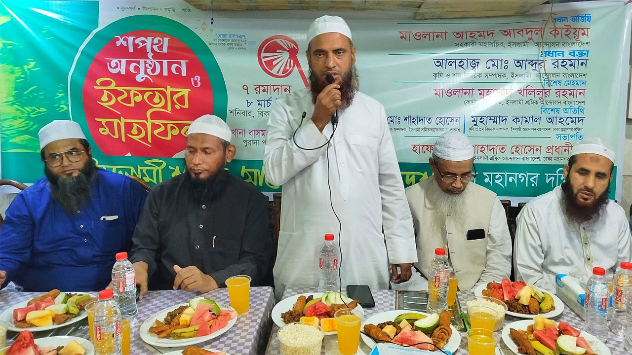 রোববার (৯ মার্চ) বিকেলে রাজধানীর পুরানা পল্টনে খানা বাসমতি রেস্টুরেন্টে ইসলামী শ্রমিক আন্দোলন বাংলাদেশ ঢাকা মহানগর দক্ষিণের শপথ অনুষ্ঠান ও ইফতার মাহফিলে প্রধান অতিথির বক্তব্যে তিনি এসব কথা বলেন।