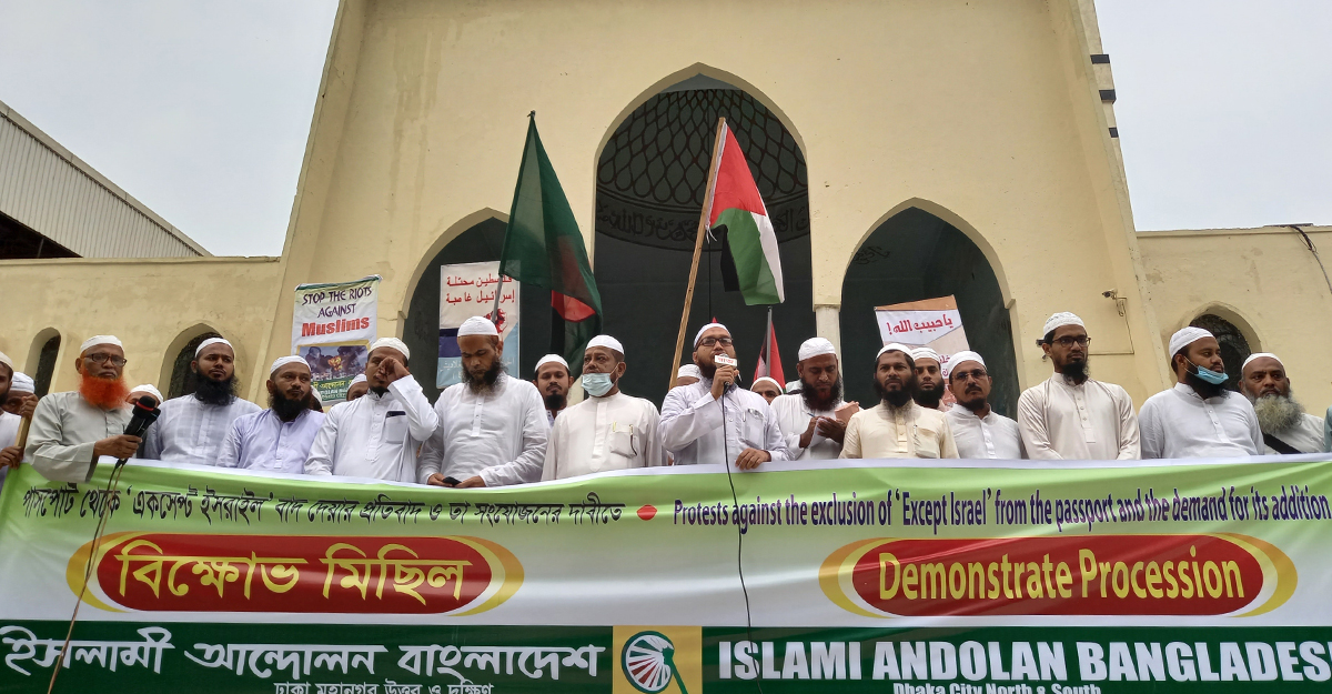 বাংলাদেশের পাসপোর্ট থেকে ‘এক্সসেপ্ট ইসরায়েল’ বাদ দেওয়ার প্রতিবাদে বিক্ষোভ মিছিল করেছে ইসলামী আন্দোলন বাংলাদেশ। অনতিবিলম্বে পাসপোর্টে শব্দযুগল পুনর্বহাল না করা হলে কঠোর আন্দোলনের হুঁশিয়ারি দিয়েছেন দলটির নেতারা।