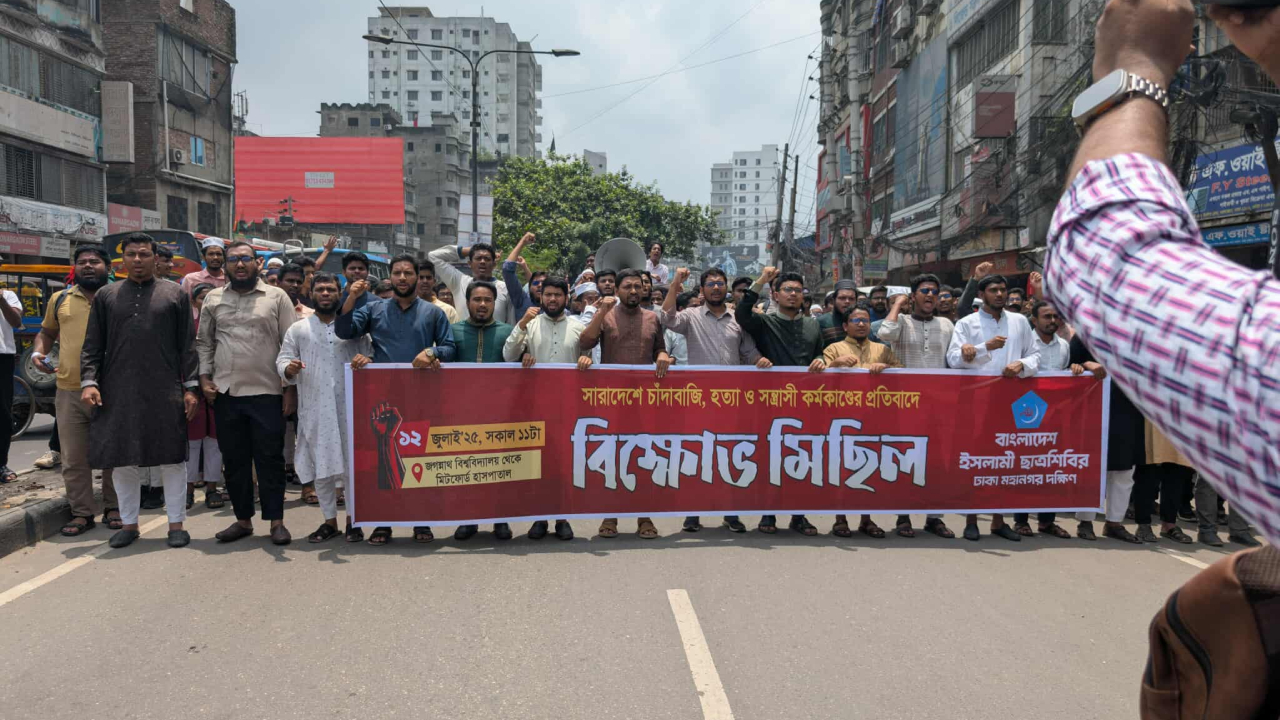 শনিবার (১২ জুলাই) সারা দেশে চাঁদাবাজি ও সন্ত্রাসী কর্মকাণ্ডের প্রতিবাদে ঢাকা মহানগর দক্ষিণ শাখা ছাত্রশিবিরের উদ্যোগে আয়োজিত বিক্ষোভ মিছিল শেষে মিটফোর্ড হাসপাতালের সামনে সমাবেশে এসব কথা বলেন সংগঠনটির নেতারা।