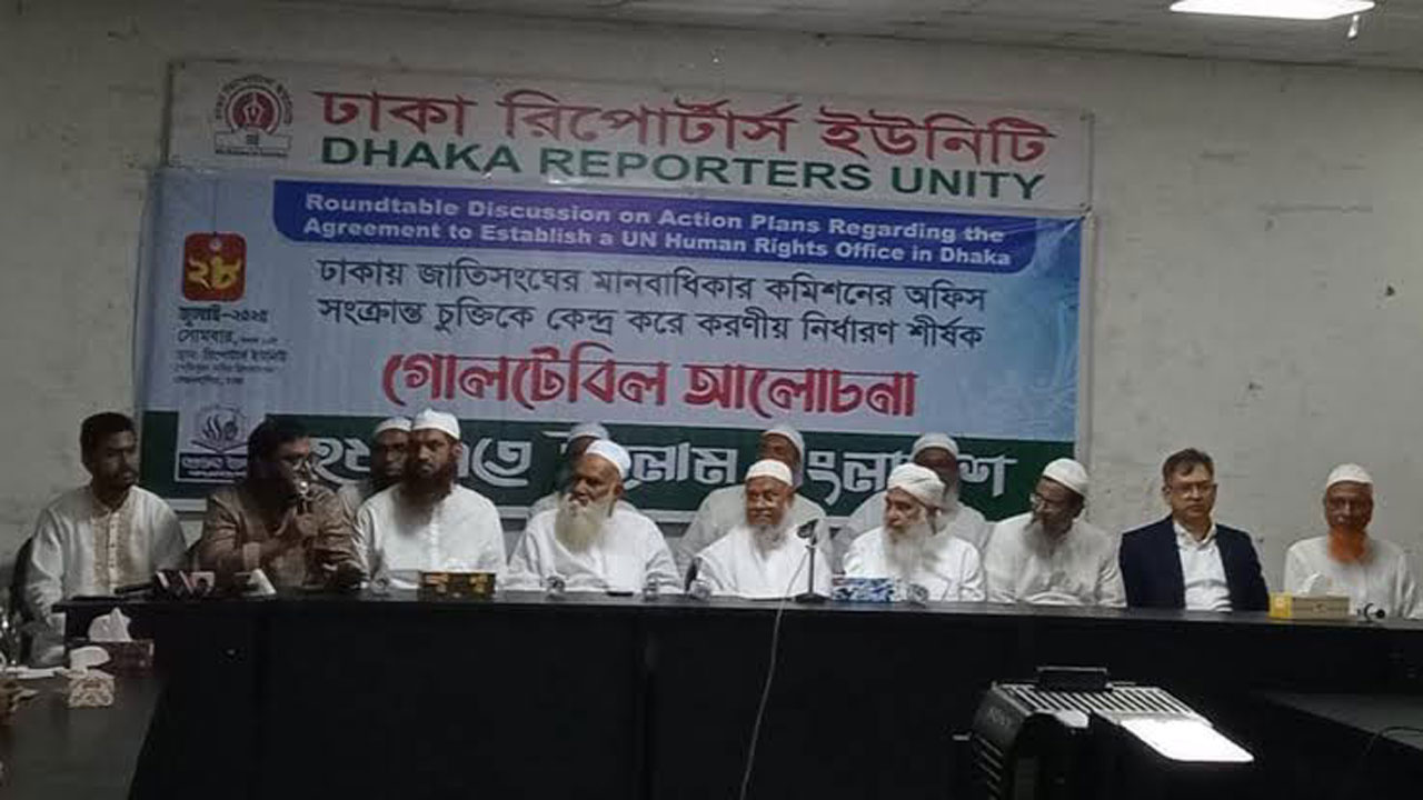 ঢাকায় জাতিসংঘের মানবাধিকার কমিশনের অফিস স্থাপনকে কেন্দ্র করে করণীয় নির্ধারণ শীর্ষক গোলটেবিল বৈঠক করেছে হেফাজতে ইসলাম। সোমবার (২৮ জুলাই) সকালে ঢাকা রিপোর্টার্স ইউনিটি মিলনায়তনে অনুষ্ঠিত বৈঠকে সভাপতিত্ব করেন দলটির মহাসচিব শায়েখ সাজেদুর রহমান।