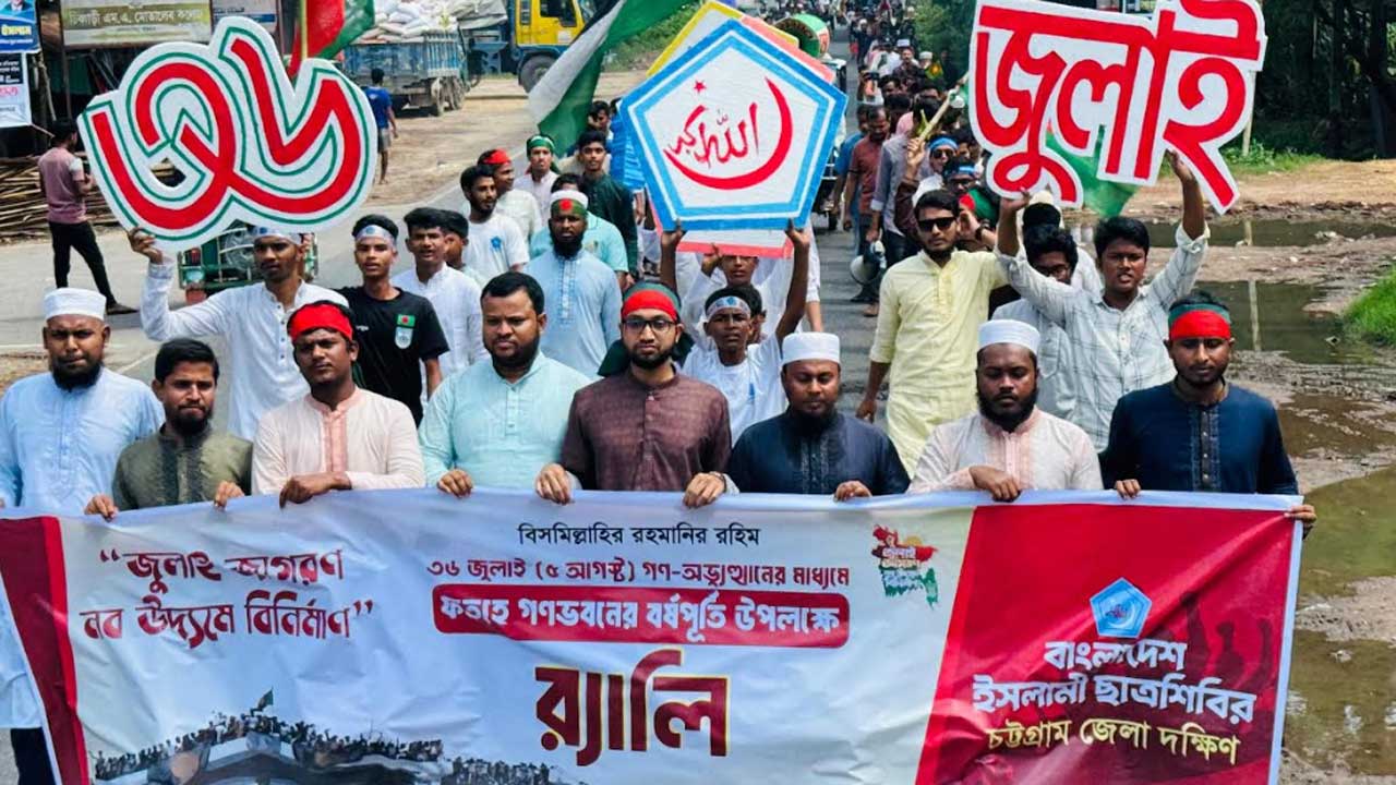ছাত্র-জনতার আন্দোলনের আওয়ামী লীগের নেতৃত্বাধীন সরকারের পতনের প্রথম বর্ষপূর্তিতে চট্টগ্রামের লোহাগাড়া উপজেলা এলাকায় র্যালি করেছে ছাত্রশিবির।
