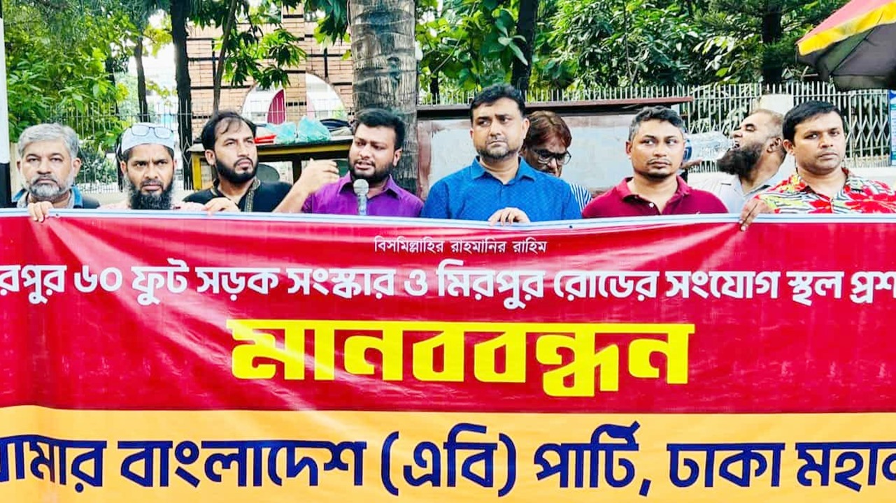 রাজধানীর অন্যতম গুরুত্বপূর্ণ সংযোগ সড়ক আগারগাঁও থেকে মিরপুর পর্যন্ত ৬০ ফুট রাস্তা দ্রুত সংস্কার ও মিরপুর সড়কের সঙ্গে সংযুক্ত অংশ প্রশস্ত করার দাবিতে মানববন্ধন করেছে আমার বাংলাদেশ পার্টি (এবি পার্টি)।