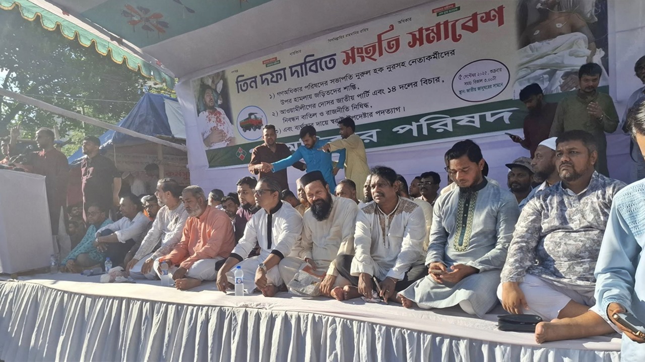 গণঅধিকার পরিষদের সভাপতি নুরুল হক নুরসহ নেতাকর্মীদের ওপর হামলায় জড়িতদের শাস্তিসহ তিন দফা দাবিতে গণঅধিকার পরিষদের সংহতি সমাবেশ চলছে।