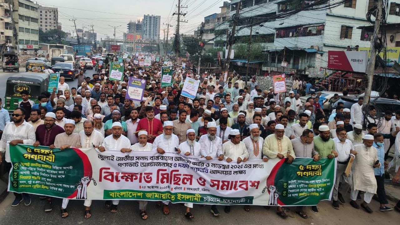 বাংলাদেশ জামায়াতে ইসলামীর কেন্দ্রীয় মজলিশে শূরার সদস্য, চট্টগ্রাম মহানগরীর সেক্রেটারির ও চট্টগ্রাম ২ ফটিকছড়ি আসনের সংসদ সদস্য পদপ্রার্থী অধ্যক্ষ মুহাম্মদ নুরুল আমিনের পরিচালনায় উক্ত বিক্ষোভ মিছিল ও সমাবেশে আরও বক্তব্য রাখেন– দলটির কেন্দ্রীয় মজলিশে শূরার সদস্য ও চট্টগ্রাম মহানগরীর অ্যাসিস্ট্যান্ট সেক্রেটারি মোহাম্মদ উল্লাহ, নগর সাংগঠনিক সম্পাদক, সাবেক ওয়ার্ড কাউন্সিলর ও চট্টগ্রাম ১০ আসনের সংসদ সদস্য পদ প্রার্থী অধ্যক্ষ শামসুজ্জামান হেলালী, নগর শ্রমিক কল্যাণ ফেডারেশনের সভাপতি এস এম লুৎফুর রহমান, চট্টগ্রাম ১১ আসনের সংসদ সদস্য পদপ্রার্থী মুহাম্মদ শফিউল আলম প্রমুখ।