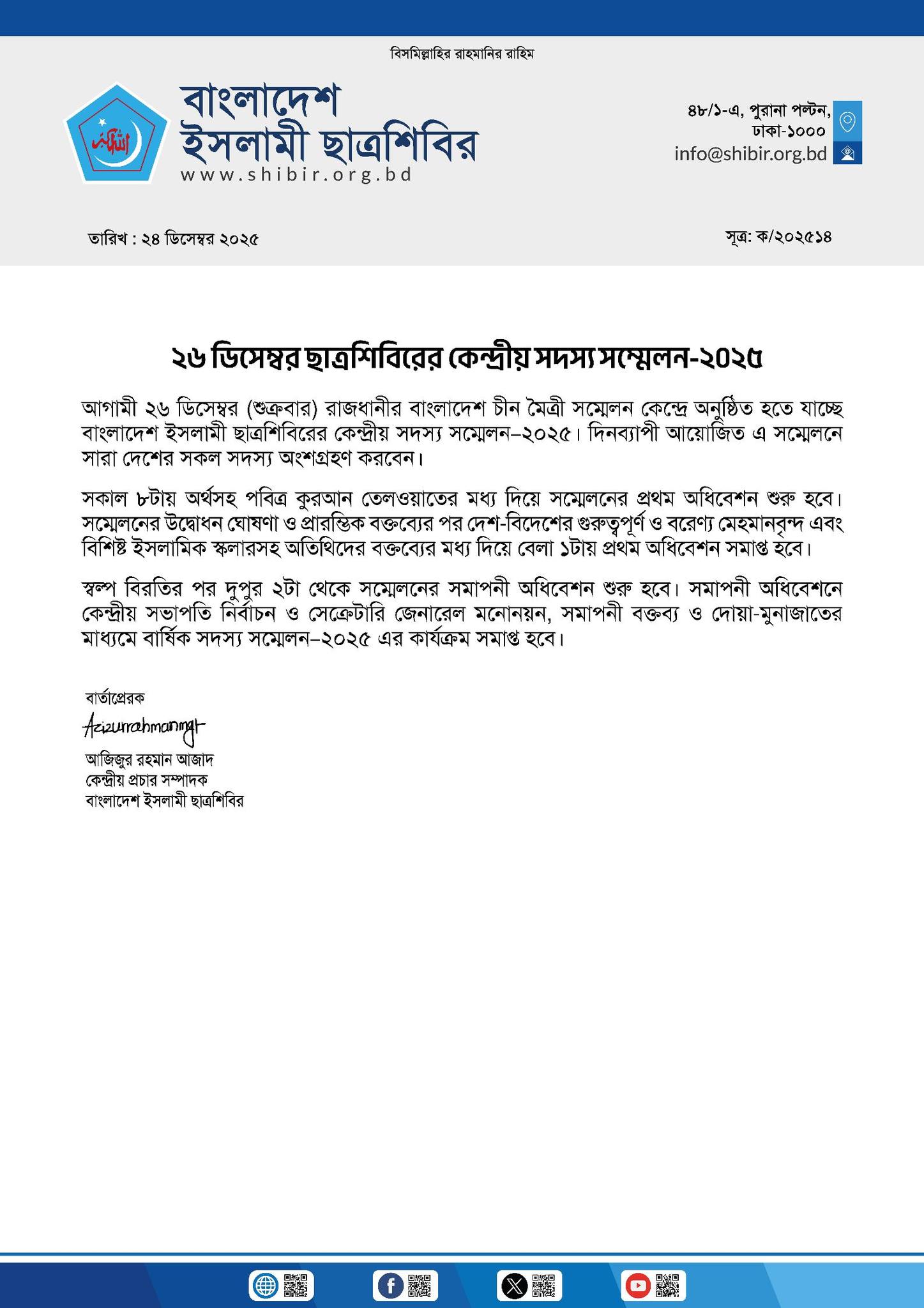 আগামী ২৬ ডিসেম্বর (শুক্রবার) রাজধানীর বাংলাদেশ চীন মৈত্রী সম্মেলন কেন্দ্রে অনুষ্ঠিত হচ্ছে বাংলাদেশ ইসলামী ছাত্রশিবিরের কেন্দ্রীয় সদস্য সম্মেলন-২০২৫।