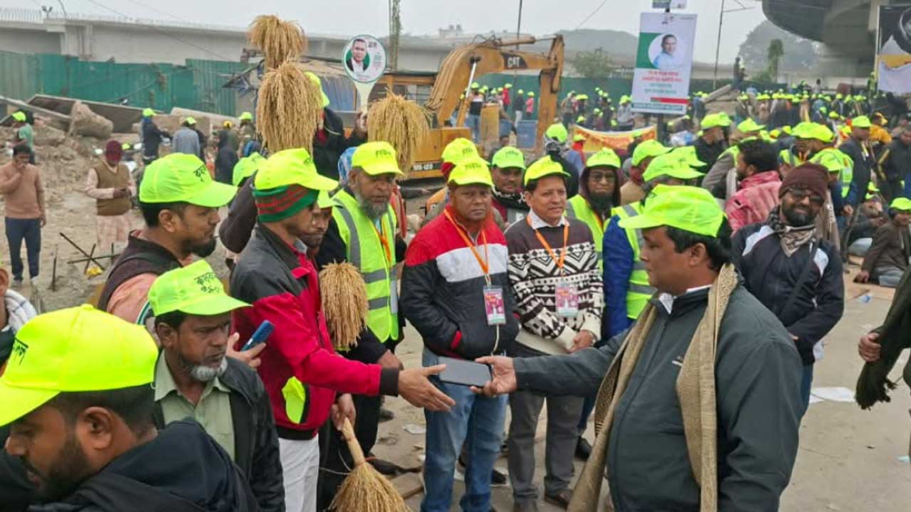 ধানের শীষ আর পতাকা হাতে সড়কের পাশে বিএনপি নেতাকর্মীরা