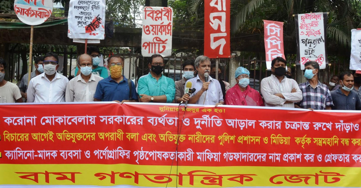 ‘তথাকথিত’ অভিযানের নামে নায়িকা ও মডেলদের ‘চরিত্র হনন ও সম্ভ্রমহানি’ বন্ধ, ক্যাসিনো-মাদক ব্যবসা ও পর্নোগ্রাফির পৃষ্ঠপোষক মাফিয়া গডফাদারদের গ্রেফতার ও বিচারের দাবিতে সমাবেশ ও বিক্ষোভ করেছে বাম গণতান্ত্রিক জোট।
