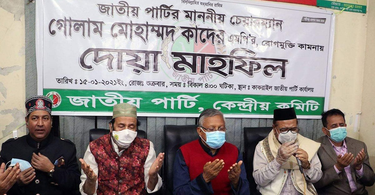 করোনাভাইরাসে আক্রান্ত জাতীয় পার্টি চেয়ারম্যান ও বিরোধী দলীয় উপনেতা গোলাম মোহাম্মদ কাদেরের রোগমুক্তি কামনায় দোয়া ও মিলাদ মাহফিল অনুষ্ঠিত হয়েছে। শুক্রবার (১৫ জানুয়ারি) কাকরাইলে দলটির কেন্দ্রীয় কার্যালয়ে এবং শ্যামপুর মসজিদে এ দোয়া মাহফিলের আয়োজন করা হয়।