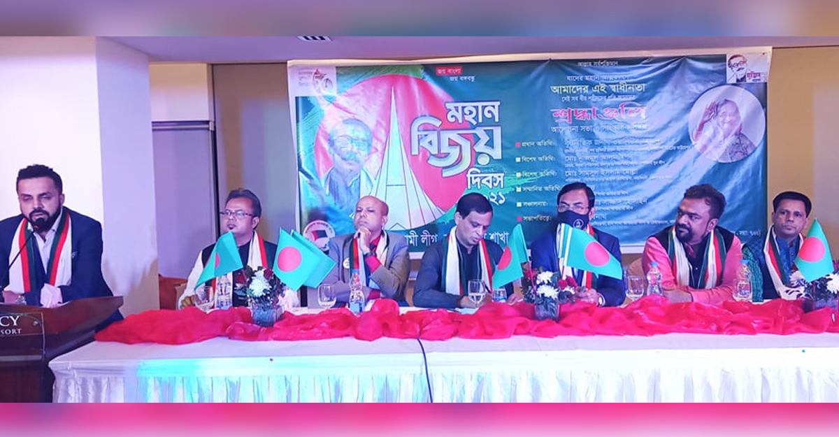 রাজধানীর খিলক্ষেতে বাংলাদেশ আওয়ামী লীগের বৃহত্তর চীন শাখার উদ্যোগে বিজয় দিবস উদযাপিত হয়েছে। দিবসটি উপলক্ষে বৃহস্পতিবার সন্ধ্যায় রিজেন্সি হোটেলের গ্র্যান্ড সামিট কনফারেন্স হলে আলোচনা সভা ও সাংস্কৃতিক অনুষ্ঠানের আয়োজন করা হয়।