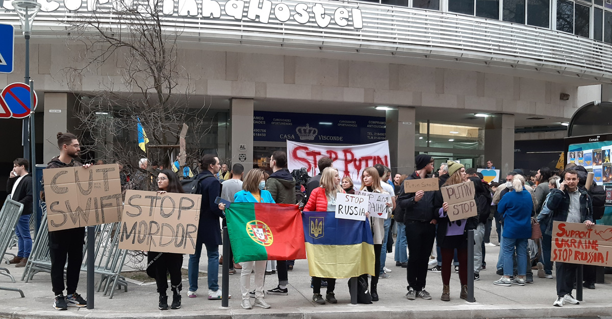 পর্তুগালের রাজধানী লিসবনে রাশিয়ান দূতাবাসে সামনে ইউক্রেনের নাগরিকরা বিক্ষোভ করেছেন। তারা রাশিয়ান সরকারের আগ্রাসনের বিরুদ্ধে বেশ কিছুদিন ধরে প্রতিবাদ জানিয়ে আসছিলেন। বৃহস্পতিবার (২৪ ফেব্রুয়ারি) বিক্ষোভে অংশ নেন পর্তুগাল সহ বিভিন্ন দেশের মানুষ।
