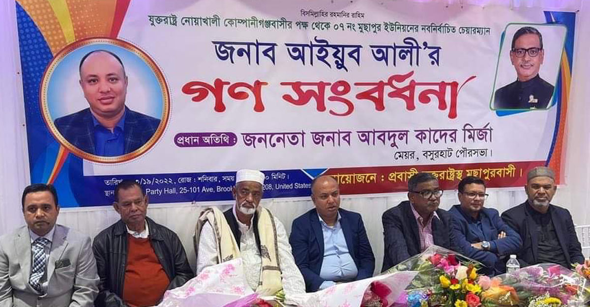যুক্তরাষ্ট্রপ্রবাসী আইয়ুব আলী গতমাসে নোয়াখালীর ইউনিয়ন পরিষদ নির্বাচনে কোম্পানীগঞ্জ উপজেলার ৭ নং মুছাপুর ইউনিয়ন পরিষদে বিপুল ভোটে চেয়ারম্যান হিসেবে নির্বাচিত হন। নির্বাচন শেষে আইয়ুব আলী বসুরহাট পৌরসভার আলোচিত মেয়র আবদুল কাদের মির্জার সফর সঙ্গী হিসেবে যুক্তরাষ্ট্রে গেলে যুক্তরাষ্ট্রের মুছাপুর ইউনিয়নের প্রবাসীদের উদ্যোগে নবনির্বাচিত চেয়ারম্যান আইয়ুব আলীকে গণসংবর্ধনা দেওয়া হয়েছে।