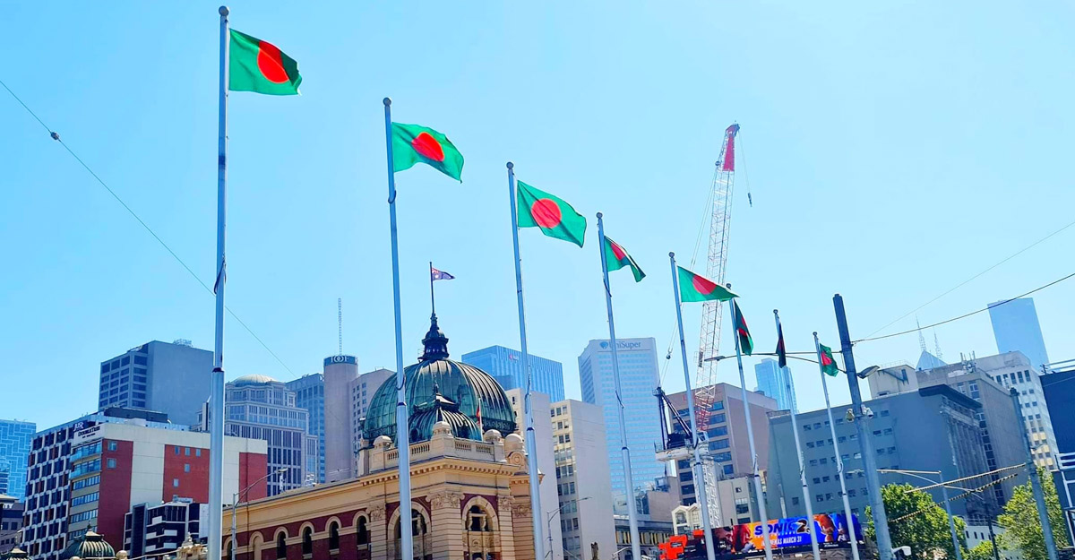 মহান স্বাধীনতা ও জাতীয় দিবসে উপলক্ষে অস্ট্রেলিয়ার মেলবোর্নে উড়ছে লাল-সবুজের পতাকা। কর্তৃপক্ষের অনুমোদন সাপেক্ষে প্রতি বছরের মতো এবারও এই আয়োজনের উদ্যোগটি নেয় বাংলাদেশি কমিউনিটি ফাউন্ডেশন। এ মাহেন্দ্রক্ষণের সাক্ষী হতে মেলবোর্নের গুরুত্বপূর্ণ স্থান ফেডারেল স্কয়ারে ভিড় জমান বাংলাদেশি প্রবাসীরা।