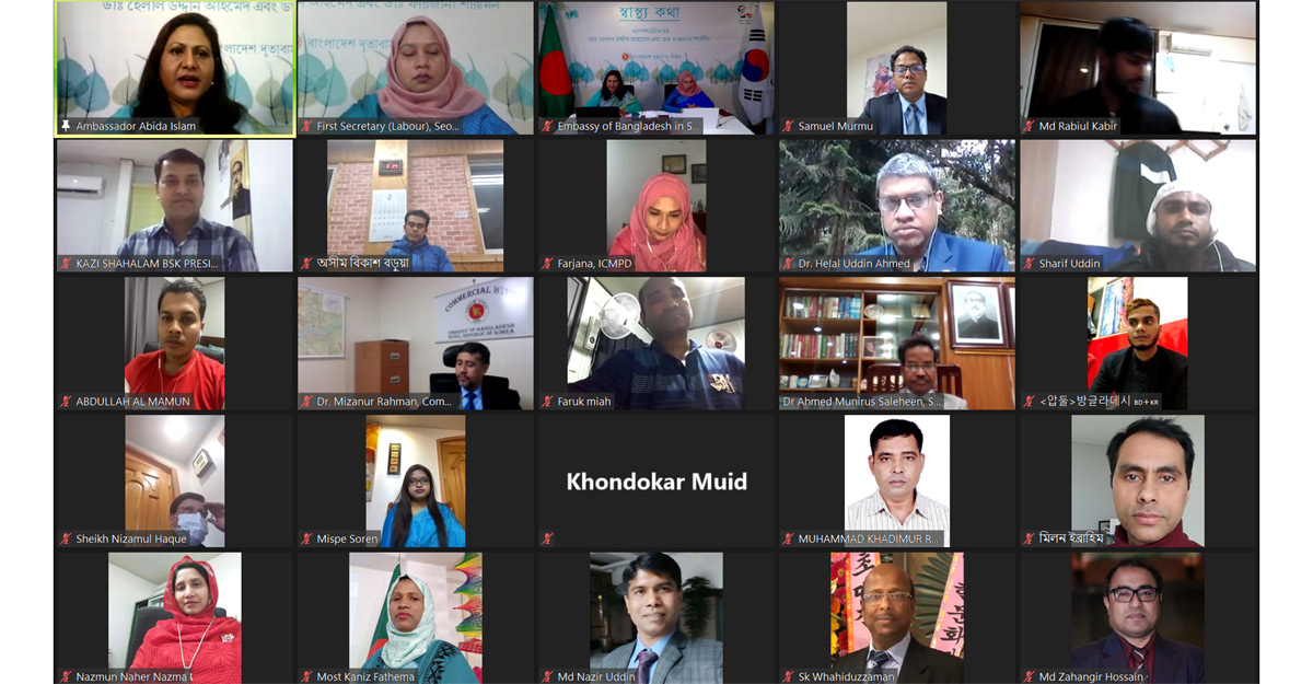 সিউলে অবস্থিত বাংলাদেশ দূতাবাসের উদ্যোগে ওয়েবিনারটিতে প্রবাসী কল্যাণ ও বৈদেশিক কর্মসংস্থান মন্ত্রণালয়ের সচিব ড. আহমেদ মুনিরুছ সালেহীন, দক্ষিণ কোরিয়ায় নিযুক্ত বাংলাদেশের রাষ্ট্রদূত আবিদা ইসলাম, জাতীয় মানসিক স্বাস্থ্য ইনস্টিটিউট সহযোগী অধ্যাপক ডা. হেলাল উদ্দীন আহমেদ এবং ক্লিনিক্যাল সাইকোলজিস্ট মিজ ফারজানা শারমিন বক্তব্য রাখেন।