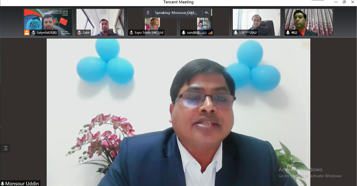 স্থানীয় সময় রোববার (১০ এপ্রিল) বিকেলে চীনে বসবাসরত বাংলাদেশি ব্যবসায়ীদের উদ্যোগে চীনা বাজারে বাংলাদেশি পণ্যের প্রচার ও প্রসার বৃদ্ধির জন্য অনলাইনে এ আলোচনা সভা অনুষ্ঠিত হয়। সভায় প্রধান অতিথি হিসেবে উপস্থিত ছিলেন বেইজিংয়ে বাংলাদেশ দূতাবাসের কমার্শিয়াল কাউন্সিলর মনসুর উদ্দিন।