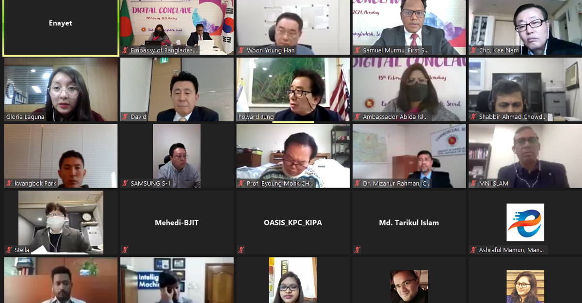 দক্ষিণ কোরিয়ার রাজধানী সিউলে বাংলাদেশ দূতাবাসের আয়োজনে ‘বাংলাদেশ-দক্ষিণ কোরিয়া: ডিজিটাল কনক্লেভ’ শীর্ষক একটি ওয়েবিনার অনুষ্ঠিত হয়েছে। সোমবার (১৫ ফেব্রুয়ারি) দেশটির স্থানীয় সময় দুপুর ২টায় এ ওয়েবিনার অনুষ্ঠিত হয়।